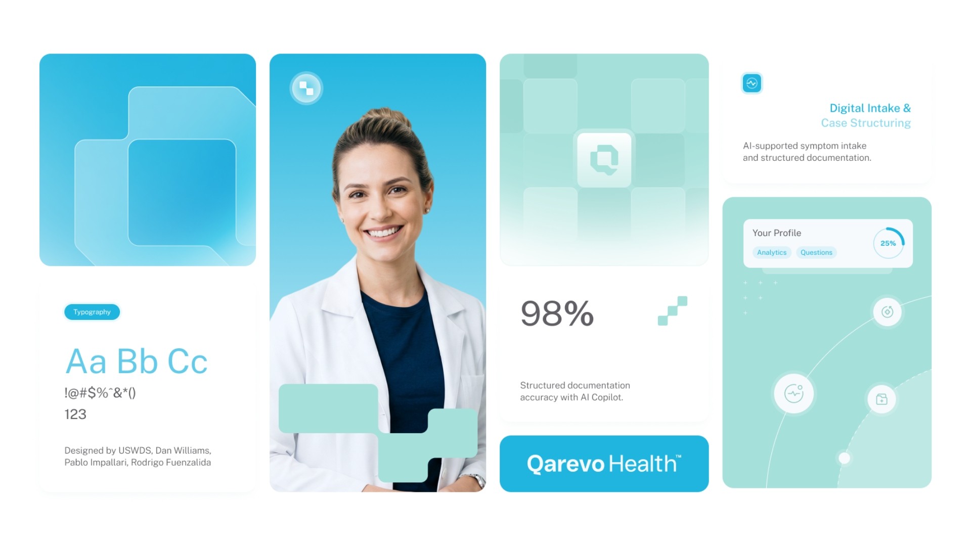 Die Farbwelt aus Deep Space Blue und Sky Surge schafft ein Spannungsfeld zwischen institutioneller Verlässlichkeit und digitalem Fortschritt. Als Schrift wurde Public Sans gewählt – entwickelt für institutionelle und digitale Kommunikation, mit einer Lesbarkeit, die auch in komplexen Interfaces oder kleinen Größen trägt. Gemeinsam kommunizieren Farbe und Typografie, was Qarevo Health sein will: die vertrauenswürdige Infrastruktur, die digitale Versorgung zum neuen Standard macht.