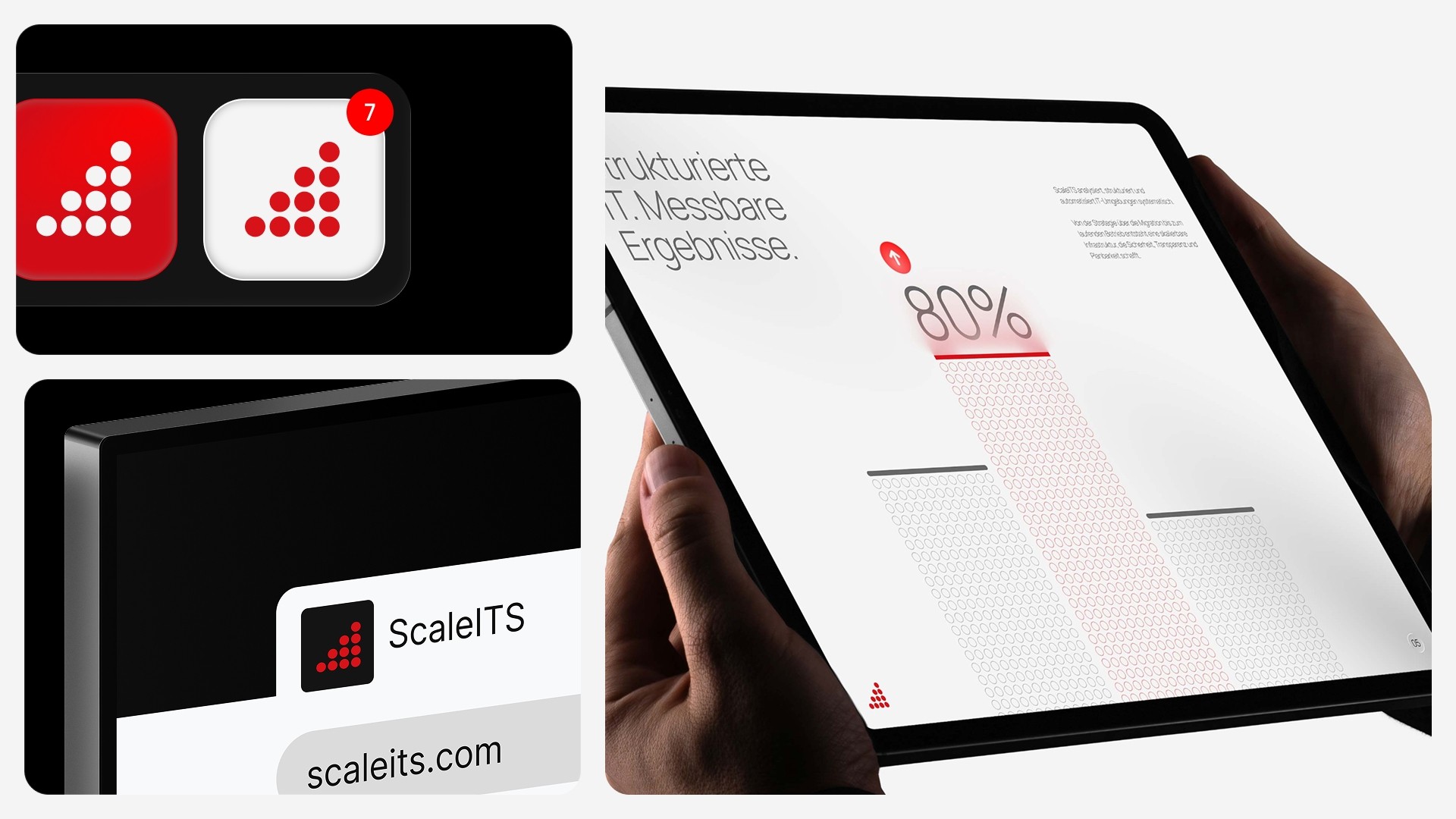 Kern der Überarbeitung war das Logo-Symbol: Von einem kleinteiligen Punktraster aus drei Säulen zu einem kompakten, modularen Grid, das Wachstum und Skalierbarkeit viel direkter kommuniziert. Gleiche Idee, stärkere Form. Parallel dazu wurde die Farbwelt disziplinierter eingesetzt — Rot als gezieltes Signalwerkzeug, Neutraltöne für Struktur und Lesbarkeit, dunkle Flächen für Präsenz. Das Ergebnis ist ein Markensystem, das über alle Touchpoints konsistent funktioniert, von App-Icon bis Präsentation.