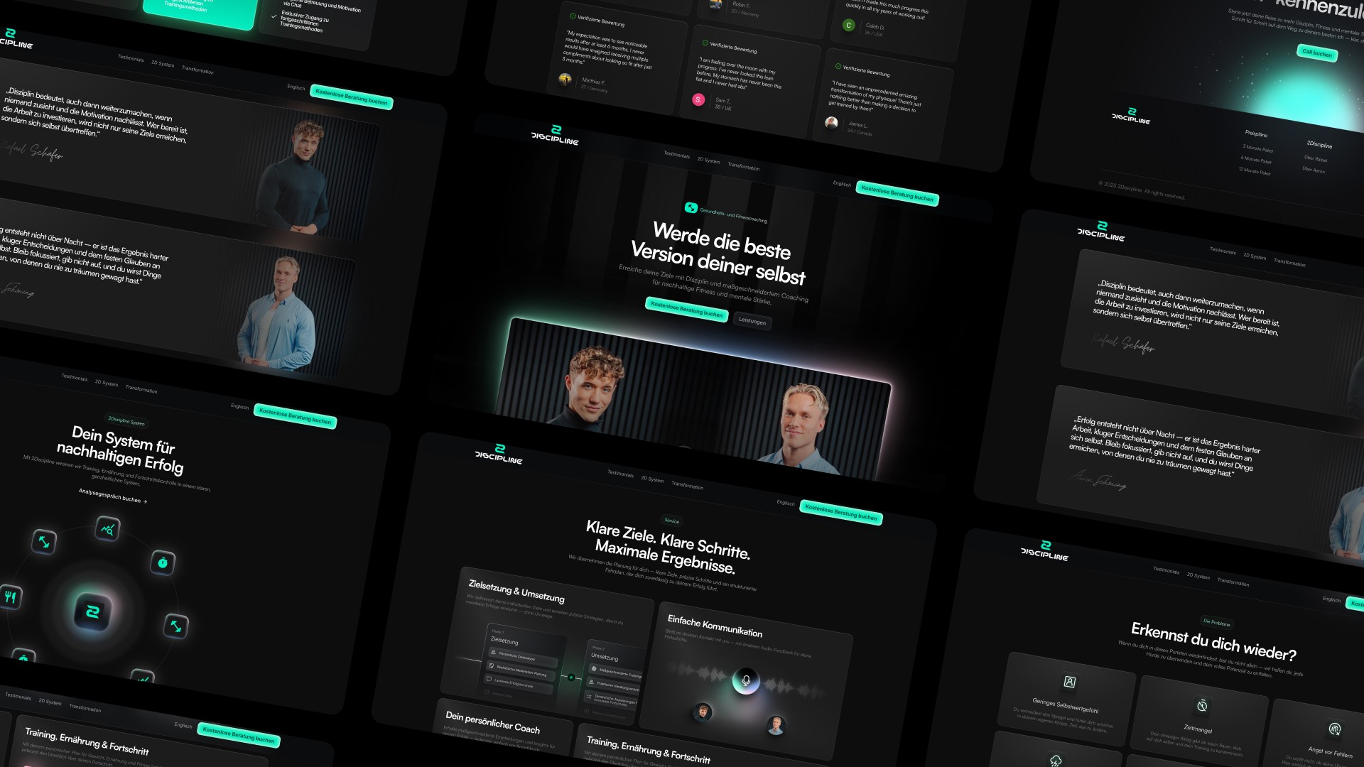 Für 2Discipline wurde die Marke von Grund auf neu entwickelt. Ziel war es, die Essenz von Disziplin, Professionalität und persönlicher Handschrift in eine klare visuelle Identität zu übersetzen. Das Branding sollte sowohl die inhaltliche Ausrichtung als auch die Gründerpersönlichkeiten widerspiegeln. Im Mittelpunkt stand die Entwicklung eines starken Corporate Designs inklusive Logo, Typografie, Farbwelt und Merchandising. Die Landingpage wurde bewusst verkaufsoptimiert konzipiert, um die Marke klar zu positionieren und Leistungen verständlich sowie überzeugend zu präsentieren.