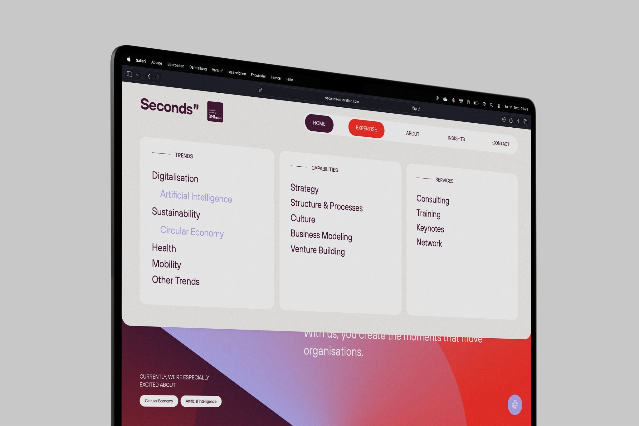Für Seconds, eine führende Innovationsberatung aus Berlin, wurde der Webauftritt als digitales Spiegelbild der eigenen Arbeitsweise verstanden. Die zentrale Idee bestand darin, wissenschaftliche Tiefe, methodische Präzision und strategische Klarheit nicht nur inhaltlich, sondern auch visuell und technisch erlebbar zu machen. In enger Zusammenarbeit mit der Designagentur Cee Cee Creative entstand ein Webkonzept, das bewusst komplex gedacht ist: mit interaktiven Elementen, fein abgestimmten Animationen und einer klar strukturierten Informationsarchitektur. Das Design folgt keinem dekorativen Ansatz, sondern unterstützt gezielt die Markenhaltung von Seconds – analytisch, progressiv und wirkungsorientiert.