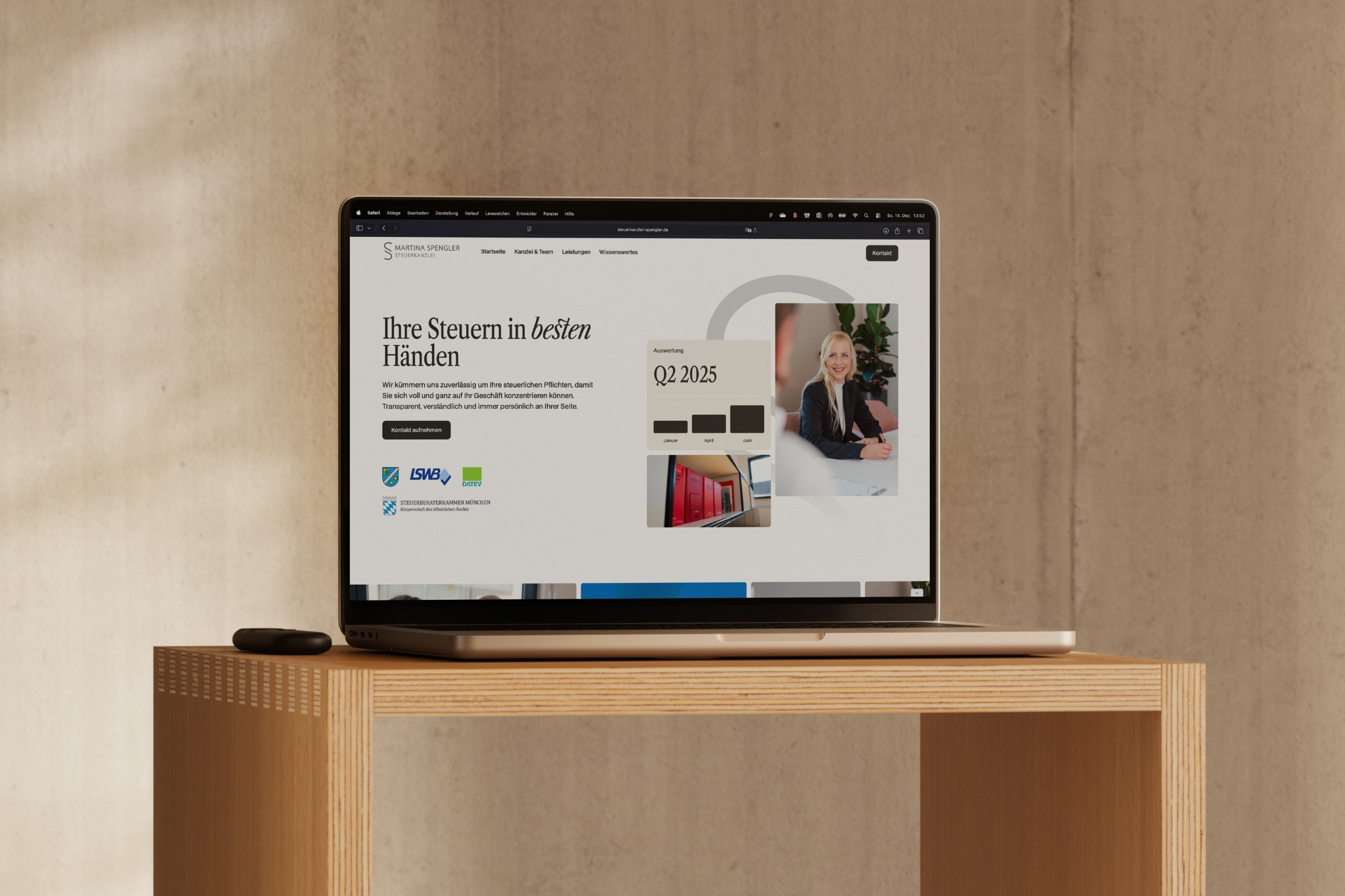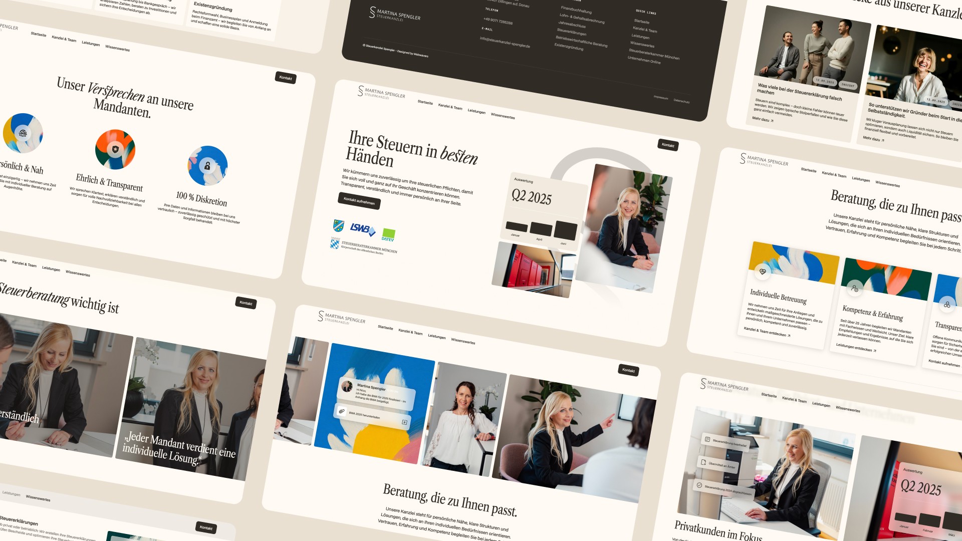 Für die Steuerkanzlei Spengler wurde der neue Webauftritt mit dem klaren Anspruch entwickelt, Steuerthemen neu zu denken – verständlich, zugänglich und zeitgemäß. Die zentrale Idee hinter dem Design war es, die Komplexität des Themas Steuer bewusst zu reduzieren und stattdessen Klarheit, Struktur und Leichtigkeit zu vermitteln. Durch eine ruhige visuelle Sprache, klare Inhalte und eine freundliche Tonalität wirkt die Kanzlei nahbar und modern. Ergänzend dazu entstand ein professionelles Fotoshooting, das echte Einblicke gibt und die Menschen hinter der Kanzlei sichtbar macht.